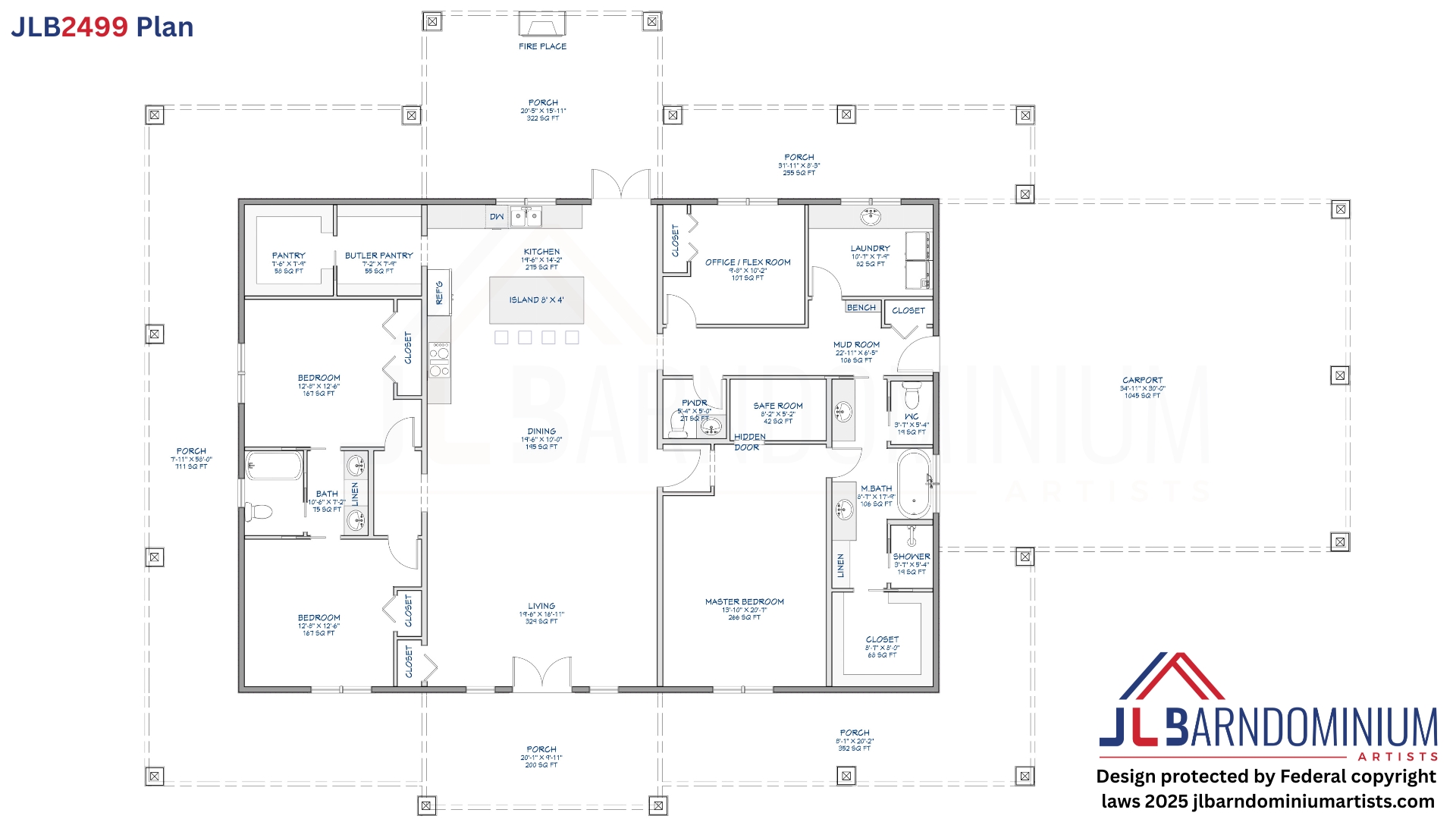 This one-story home features 2,499 sq. ft. of heated living space with 3 bedrooms, 2.5 baths, and premium additions like a pantry, butler’s pantry, office, laundry area, and safe room. Enjoy 1,840 sq. ft. of wrap-around porches, perfect for relaxing outdoors, plus a 2-car carport (1,045 sq. ft.) for added convenience.