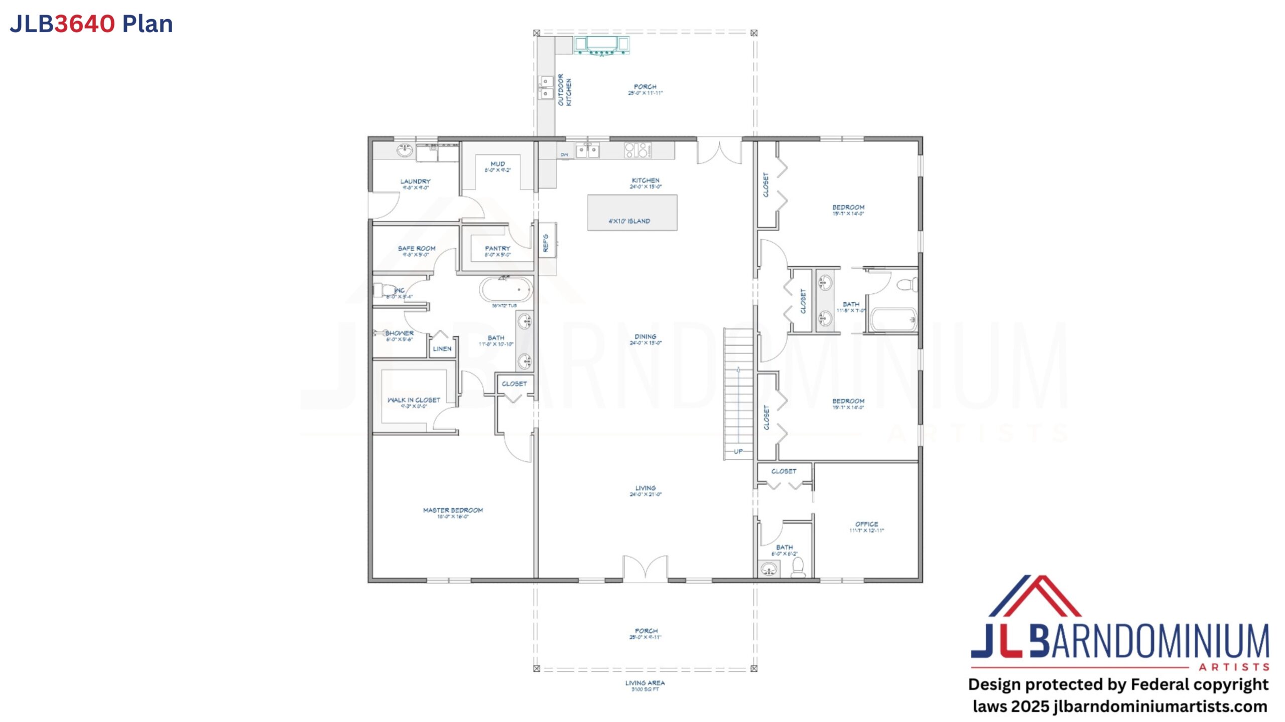 This two-story design offers 3,640 sq. ft. of heated living area, featuring an open floor plan, 3 bedrooms, 3.5 baths, and versatile spaces like a flex room, office, and safe room. The outdoor kitchen and spacious porches (546 sq. ft.) create the perfect setup for entertaining, while the pantry and laundry room keep everything organized.